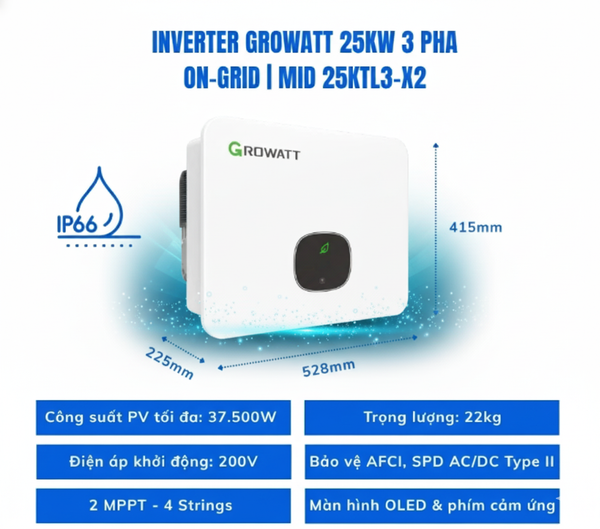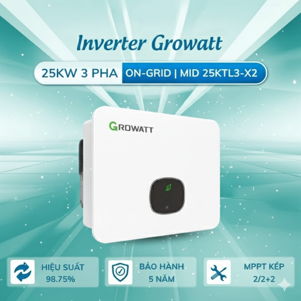 Inverter Growatt 25kW 3 pha – MID25KTL3-X2 có hiệu suất tối đa đến 98.75%, thiết kế MPPT kép (hỗ trợ nhiều strings), chuẩn IP66 và trọng lượng nhẹ (22 kg) giúp lắp đặt dễ dàng. Thiết bị thuộc dòng MID-X2, phù hợp cho các dự án thương mại và công nghiệp quy mô vừa; được Solar DH phân phối chính hãng tại Việt Nam với chính sách bảo hành 5 năm.
