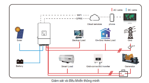- Chế độ lập trình lưới điện, ngoài lưới, UPS; ưu tiên nguồn cho Pin hoặc lưới.