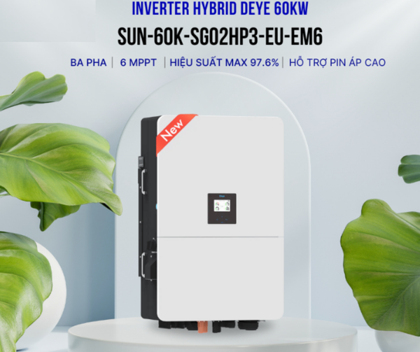 Inverter Hybrid Deye 60kW — SUN-60K-SG02HP3-EU-EM6 là dòng biến tần hybrid công nghiệp cao cấp được thiết kế cho các hệ thống điện mặt trời có lưu trữ năng lượng, hoạt động ổn định cả ở chế độ hòa lưới và độc lập. Với công suất mạnh mẽ 60kW cùng hiệu suất tối đa 97,6%, sản phẩm giúp tối ưu nguồn năng lượng, giảm tải điện lưới và tăng độ an toàn cho doanh nghiệp.